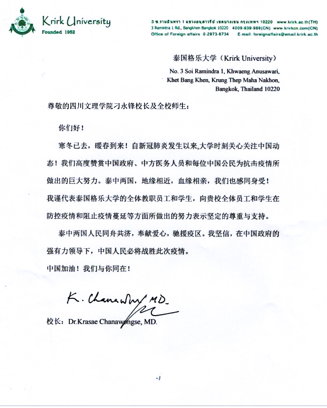 “中国加油!我们与你同在”。今日,学校收到泰国格乐大学校长Dr. Krasae Chanawongse,MD来信,他向beat365全体师生在防控疫情和阻止疫情蔓延等方面所做出的努力表示坚定的尊重与支持,对中国政府、中方医务人员和每位中国公民为抗击疫情所做出的巨大努力表示高度赞赏,并坚信在中国政府的强有力领导下,中国人民必将战胜此次疫情。 此前,格乐大学曾于2019年来校交流访问,双方商议拟在教师访学、学生交流交换等方面开展合作。