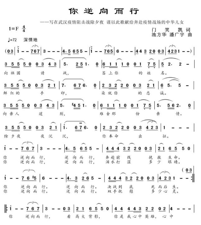 《你逆向而行》写于武汉疫情阻击战除夕夜,谨以此歌献给逆向而行奔赴疫情战场的中华儿女。潘老师接连谱曲《你是天下最美的兵》《一声到》《爱的力量,没有距离》等歌曲向白衣天使和默默无闻的逆行者致敬,就像歌词里说的:你是天下最美的兵,一声到,是向承诺签到、一声到,是祖国需要,一声到,是向目标奔跑,一生到,是人民的需要。哪怕千里万里,哪怕病毒阻隔,每个中华儿女的心依旧紧紧相依。