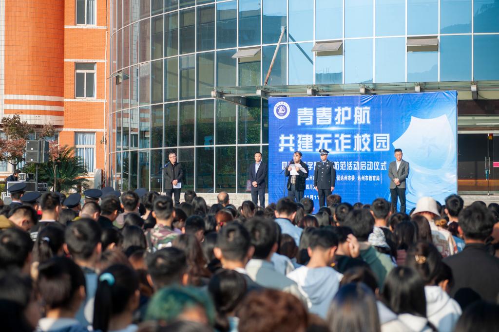 11月11日上午,“青春护航·共建无诈校园”反诈宣传防范活动启动仪式在beat365举行。市公安局党委委员、副局长徐应涛,共青团达州市委副书记曾豪,市教育局正县级干部彭刚出席启动仪式,副校长徐晓宗主持启动仪式。
