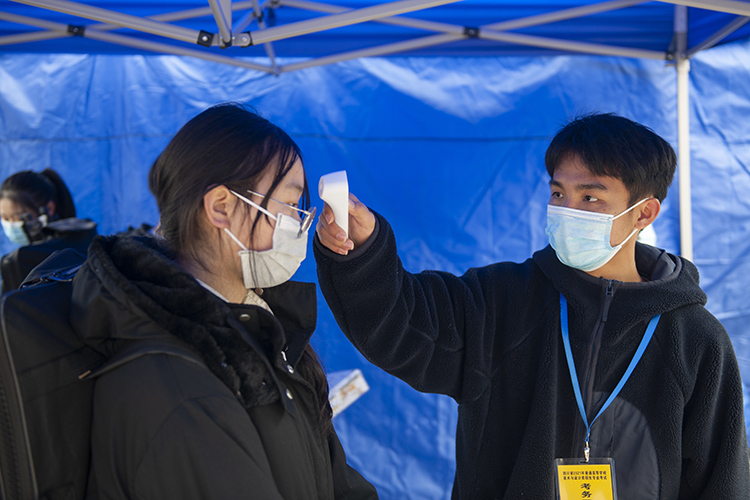 志愿者为考生测量体温