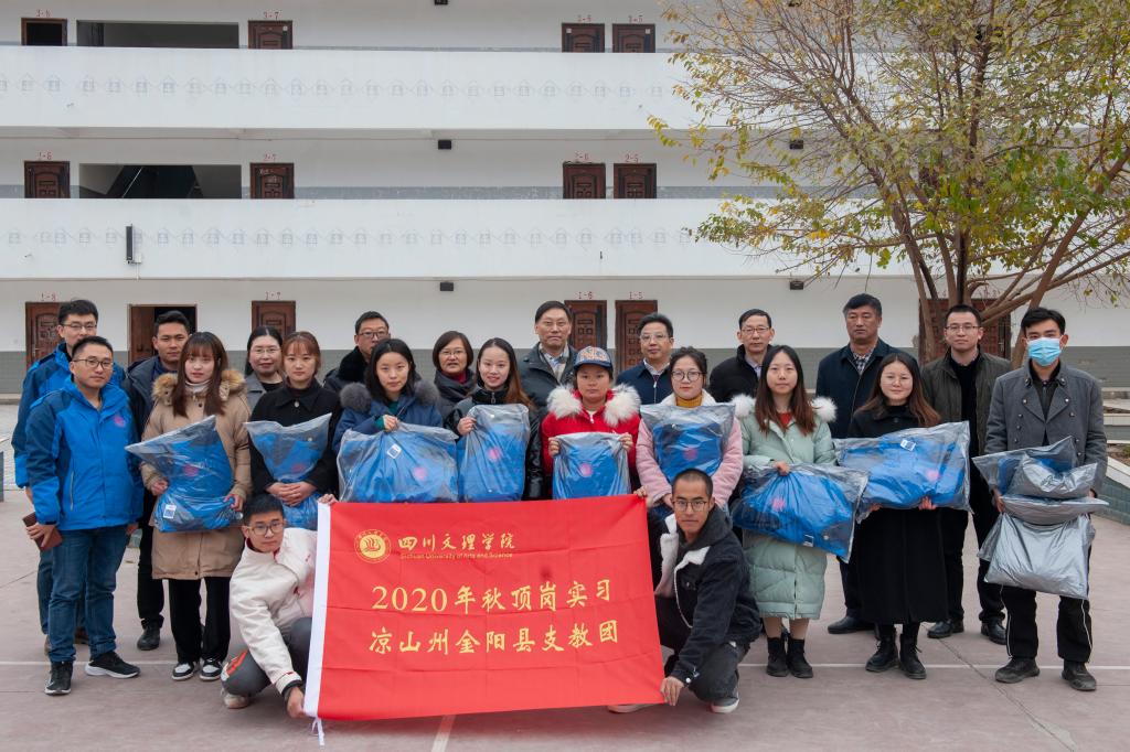 王成端对金阳支教学子给予了高度评价。他深情地说,截止目前,学校已分三批选派了298名优秀师范生和6名带队教师前往金阳开展顶岗支教工作。从今天的走访中,我看到了大家的坚守、奉献、敬业与对基础教育的深深热爱,看到了金阳县委、县政府,尤其是金阳县教体科局和各支教学校领导老师无微不至的关怀指导,看到了质朴的孩子们对教育的期望和对未来美好生活的向往。支教师生深入贫困孩子家中家访,指导孩子们排练文艺节目,融入当地环境推广普通话,开展义务维修等等,这些画面都深深映在我的脑海里。他鼓励同学们,扎根基层教育,坚守育人初心,响应时代召唤,肩负时代使命,砥砺奋勇前行。