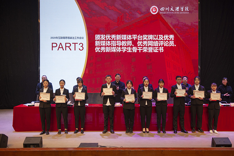 与会校领导为2020年校内优秀新媒体平台、指导教师、网络评论员、学生骨干颁发奖牌及证书。