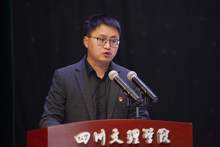 智能制造学院党总支副书记侯翔作为优秀指导教师代表、外国语学院唐嘉渠作为优秀新媒体学生骨干代表分别作交流发言。