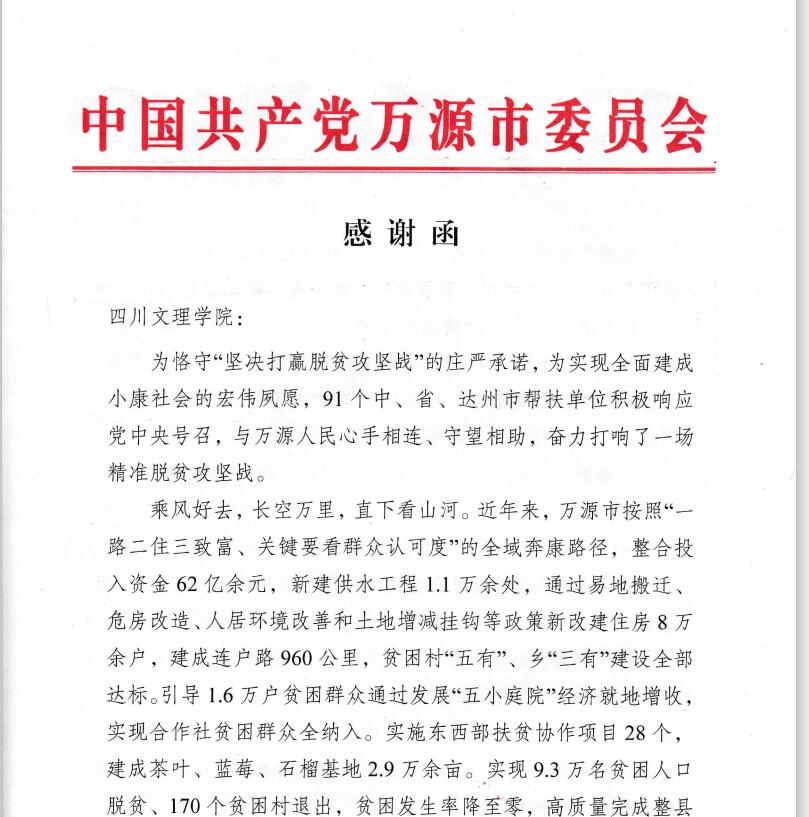 日前,中共万源市委、万源市人民政府致函beat365,感谢beat365对万源市脱贫攻坚工作的大力支持。