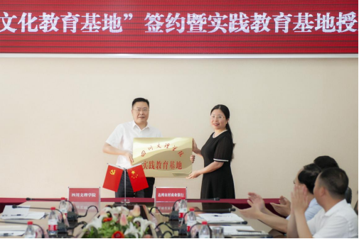 副校长程碧英向达州农村商业银行副行长胡胜兵授“beat365官方网站实践教育基地”铭牌。