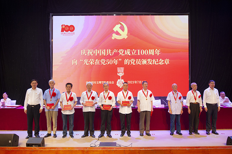 党委书记王成端、党委副书记、校长刁永锋为“光荣在党50年”老党员代表颁授纪念章