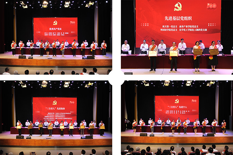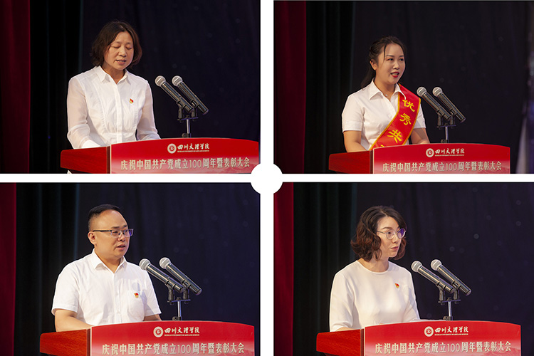 受表彰的先进基层党组织代表彭时敏、优秀共产党员代表赵栅凌、优秀党务工作者代表刘天、优秀思想政治工作者代表王文娟发言。他们分享了各自爱党爱国爱校爱生的工作经历,并表达了在新时代征程中,将深入学习贯彻习近平总书记在庆祝大会上发表的重要讲话,牢记教书育人的职责使命,为学校改革发展、为党的教育事业作出积极贡献。