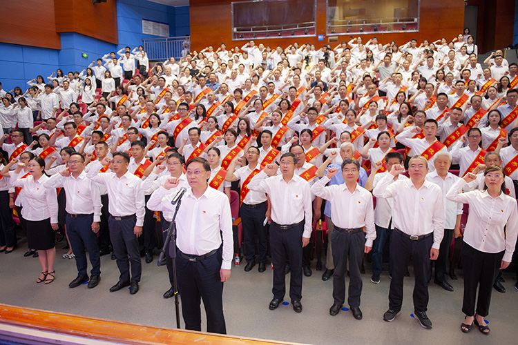 王成端带领与会全体新党员进行入党宣誓,带领老党员重温入党誓词,并向全校党员表示节日的慰问,向“光荣在党50年”的老党员、受到表彰的先进集体和优秀个人表示热烈的祝贺并致以崇高的敬意。向奋斗在学校教学、科研、管理、服务第一线、教书育人、立德树人、推动学校事业破浪前行、持续发展的老师们和同志们表示衷心的感谢。