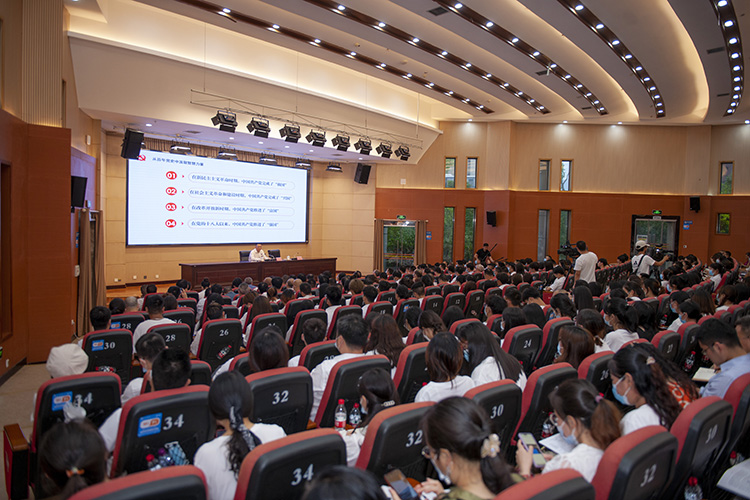 严卫东首先讲述了中国共产党百年党史四个历史阶段取得的丰功伟绩,在新民主主义革命时期,中国共产党完成了“救国”;在社会主义革命和建设时期,中国共产党完成了“兴国”;在改革开放时期,中国共产党完成了“富国”;在党的十八大以来,中国共产党推进了“强国”。中国共产党在百年历程中取得的丰功伟绩根源于“10个坚定不移”即:坚定不移坚持党对一切工作的领导,坚定不移贯彻新发展理念,坚定不移推进全面深化改革,坚定不移推进依法治国,坚定不移加强党对意识形态工作的领导,坚定不移在发展基础上保障和改善民生,坚定不移推进生态文明建设,坚定不移推进国防和军队现代化建设,坚定不移推进中国特色大国外交,坚定不移全面从严治党。