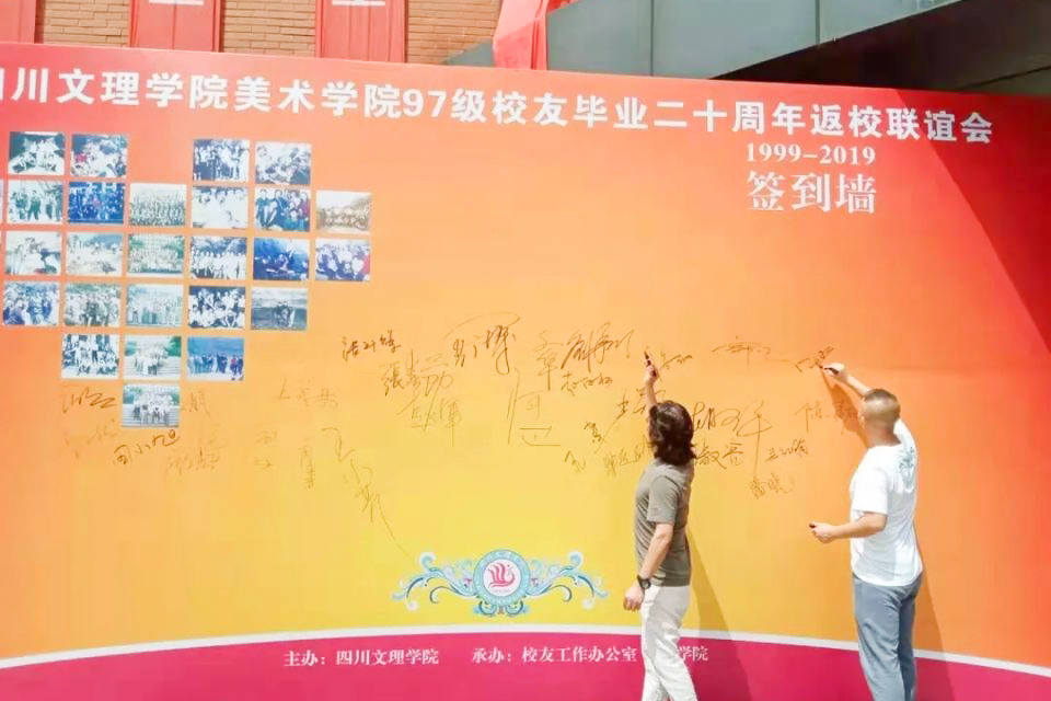 校友在签到墙上签名留念