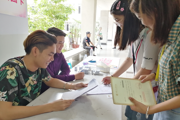 在迎新服务工作中, 志愿者是一道靓丽的风景线,在今年的迎新现场,有两位特别的身影吸引许多许多同学的眼球,来自财经管理学院老挝留学生苏龙和王鹏积极参与到校园卡的发放工作中,用流利的中文为新生讲解校园卡的使用方法。他们表示,能有机会参与学校的迎新工作中,感觉到特别的荣幸,在帮助他人时不仅收获了快乐,还能较好的锻炼了自己沟通能力和语言表达能力,希望有机会能继续参与到下次迎新志愿服务工作中。