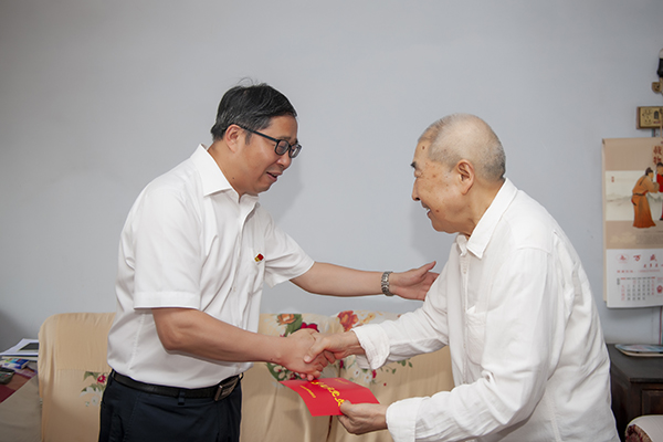 党委书记王成端走进81岁高龄退休老党员黄守毅家中,亲切地与老人拉家常、问寒问暖,详细了解退休老党员的身体、生活和家庭情况,现场帮助解决生活中困难,充分体现了学校党委时刻把老党员的冷暖放在心上,切实让离退休老党员老有所养、老有所乐、老有所为,安心安度晚年。并要求离退休党总支和相关职能部门要高度重视离退休老党员工作,不要忘记发展成果路上老同志的奋斗足迹和奉献精神,关心和照顾好老党员的生活,同时送上了党组织的节日祝福。