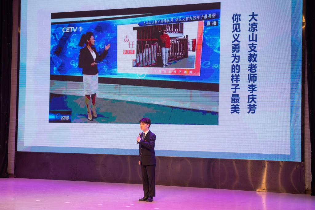 “意义就是激励自己同时也照耀他人、温暖社会的精神光芒。为党育人、为国育才是学校46年坚持做的有意义的事,并会一直坚持下去。”接续党委副书记侯忠明的致辞,文学与传播学院的王虹雨首场的《一封感谢信》讲述了学校与万源结对的7年来与当地的父老乡亲结下的深厚情谊。2022年1月30日,在除夕前一天学校收到来自万源市委市政府发来的感谢信,感谢学校从2015年来发挥学校在教育、科技、人才、文化等方面的综合优势服务地方脱贫攻坚,助力建设“生态福地•和美万源”新篇章。