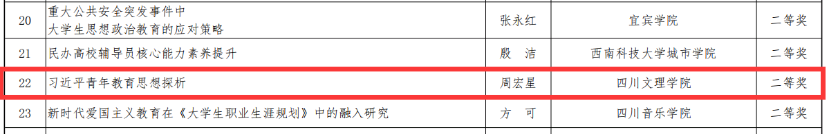 日前,中共四川省委教育工委、四川省教育厅公布了高校思想政治教育名师工作室名单,四川省高等学校学生思想政治工作研究会公布了2021年、2020年全省高校辅导员优秀论文评选结果。外国语学院刘天主持的“巴山青语”刘天名辅导员工作室申报成功,化学化工学院崔宝玉撰写的论文《我国高等教育美育的政策演进与研究变革——基于 CiteSpace 的文献计量可视化分析》获得2021年优秀论文一等奖、康养产业学院周宏星撰写的论文《习近平青年教育思想探析》获2020年优秀论文二等奖。