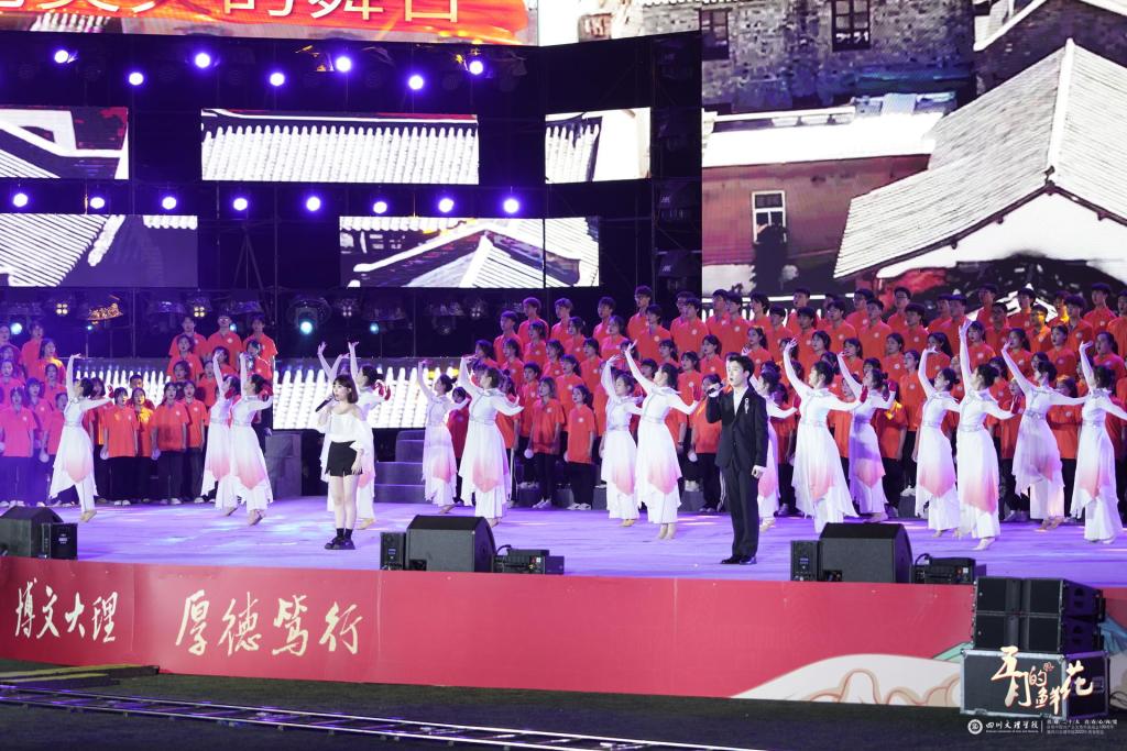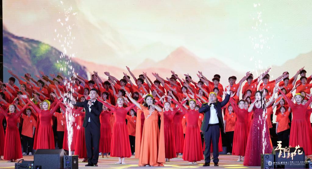 第二篇章“岁月赞歌”由《最美》《花开新时代》《青春不一样》等3首歌曲和舞蹈表演《青春为祖国加油》组成,歌颂文理学子以青春奔赴理想,以热血迎向未知的奋斗精神。其中《花开新时代》由音乐与演艺学院李玥欣老师演唱。她说:“一首好的歌曲需要每个环节都不可敷衍,都需要恰到好处。和一般的晚会歌曲不同,《花开新时代》歌词和音乐都很有新意。这首歌歌词既有时代性,又有艺术性;旋律优美,在配器上更注重意境的表现,在享受听觉盛宴的同时,更有‘花开’现场的感觉。我将自己对学校的感情都融进了歌里,化作音符,带着文理人对这个时代的美好与对未来的无限憧憬:愿美丽的文理学院每天都沐浴新时代的春风,每天都是花开的季节。”