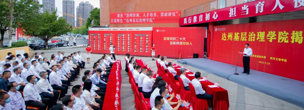 9月29日,由中共达州市委组织部和学校共建的“达州基层治理学院”揭牌仪式在莲湖校区艺术传媒大楼前隆重举行。市委常委、组织部部长江彬出席会议,学校党委书记王成端致辞,党委副书记、校长刁永锋主持仪式。