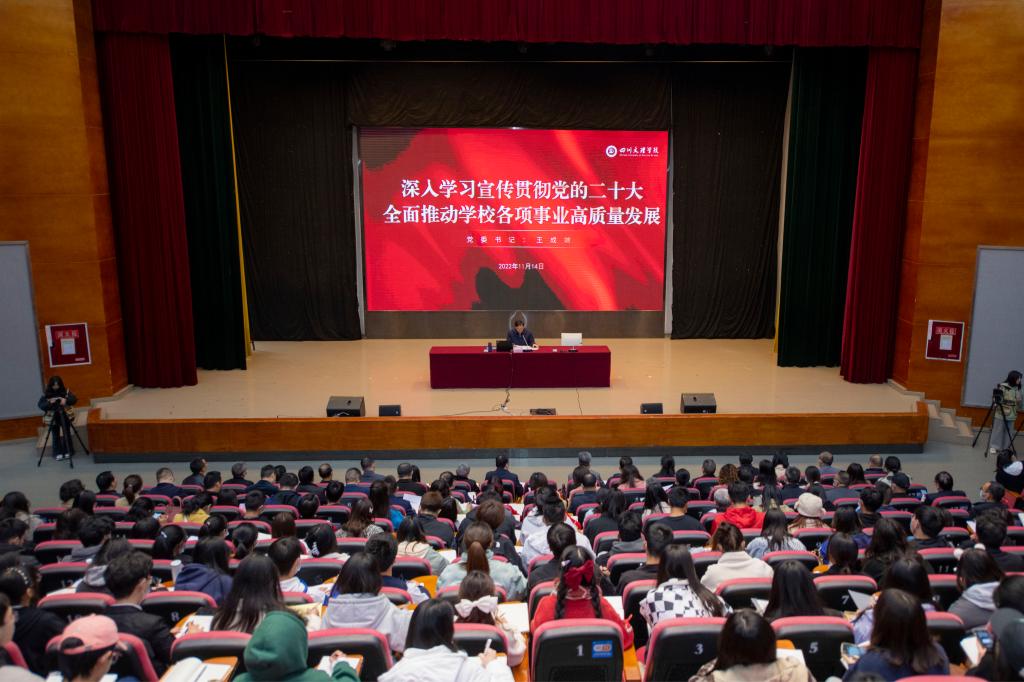 11月14日,学校在莲湖校区举行党的二十大精神宣讲会。党委书记王成端宣讲党的二十大精神,党委副书记、校长侯忠明主持,党委副书记、纪委书记张超,副校长徐晓宗、朱兴华、邓杰、程碧英出席,各职能部门负责人、党的二十大精神宣讲分团成员、各二级党委书记、党总支书记、思政课教师代表、辅导员代表及师生代表近300人参加会议。