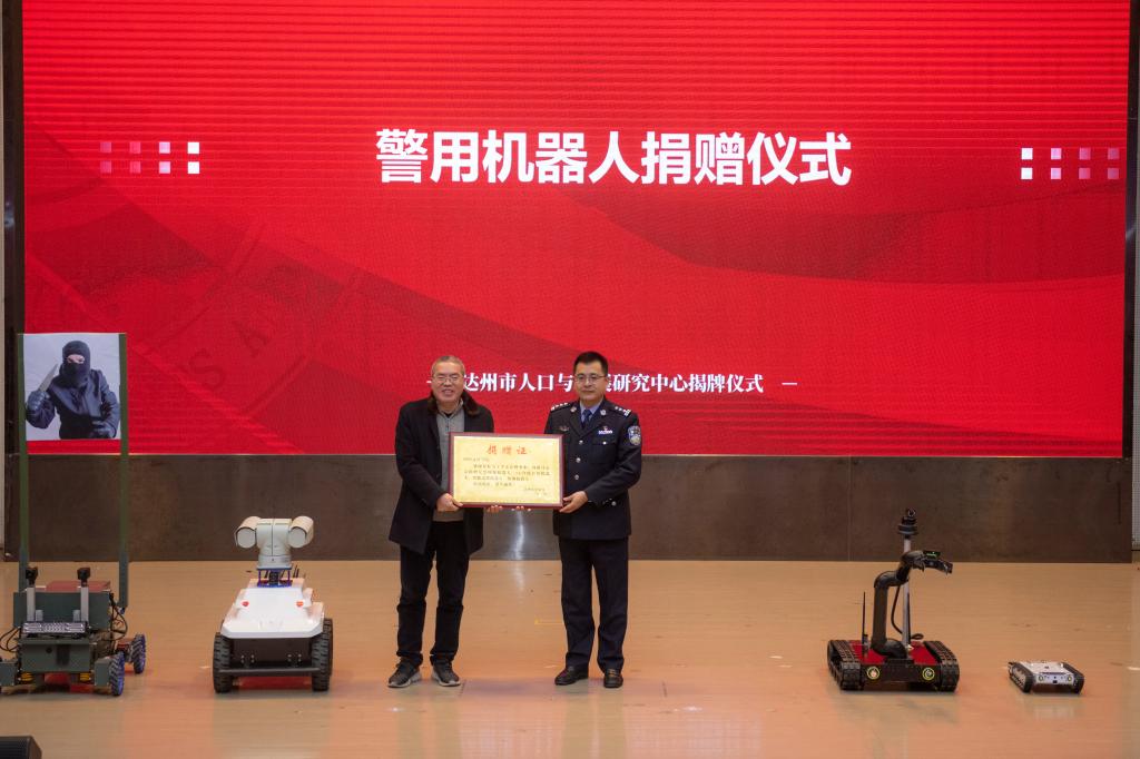 1月3日,达州市人民政府、beat365官方网站共建“达州市人口与发展研究中心”揭牌仪式在莲湖校区举行。党委书记王成端、市人民政府副秘书长、市信访局局长余世斌为“达州市人口与发展研究中心”揭牌,党委副书记、校长侯忠明致辞,市人民政府副市长、市公安局局长高武林讲话,副校长徐晓宗代表学校为市公安局捐赠4台警用机器人,市政府办公室副主任许正彩、市公安局常务副局长许高山出席活动。副校长邓杰主持揭牌仪式。