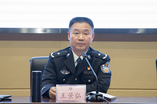 随后,身着警服的王景弘局长面向会场行了一个标准的敬礼开始了本次交流。他介绍本次讲座的主要目的,一是从国际宏观视野看,青年是与刑事犯罪的关联最多的因素之一,必须防患未然;二是从时代发展趋势看,青年是肩负时代使命、接收祖国挑选的关键群体,必须规矩绳墨;三是从警务革命走向看,青年是预防犯罪、减少罪害的主要群体之一,必须精心呵护。
