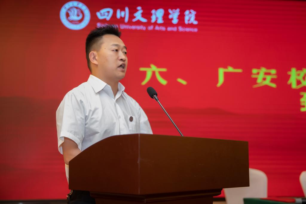 侯忠明说,今天成立的广安校友会,是学校成立的第二个市级校友会,不仅承载着广大广安校友的殷殷期盼,也承载着全校师生的真情期待。广安校友会的成立,广安校友从此有了一个互通信息、增进往来、携手并进的交流平台。希望校友以广安校友会成立大会为开端,遇喜庆消息,请大家及时转告、积极参与、共享喜悦;遇困难时分,请大家多多支持、互帮互助、共克时艰。为进一步做好广安校友会工作,他提出四点希望:一要不断加强校友分会平台建设;二要发挥好桥梁纽带作用;三要发挥好互助合作作用;四要深入广泛地发动校友。学校将全力支持广安校友会工作,加强密切联系,促进校友会更加扎实、更有成效地开展各项活动;将积极宣传校友、服务校友、赋能校友合力打造“学校+校友”共同体,汇聚成推动学校发展的磅礴力量。