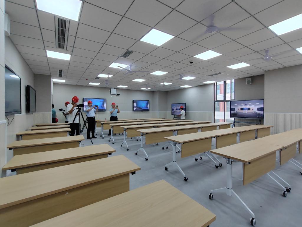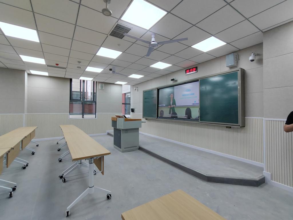 顺着莲湖东区天桥来到综合教学楼,大气整洁的教学楼让人心生敬意,乘坐电梯来到教室,智慧电子屏、桌椅、空调、风扇等一应俱全,宽大的玻璃窗让整个教室显得格外明亮。穿过一段连廊,来到食堂,空调和风扇安装齐备,不论酷暑还是严寒,师生都能舒心地享受美食。