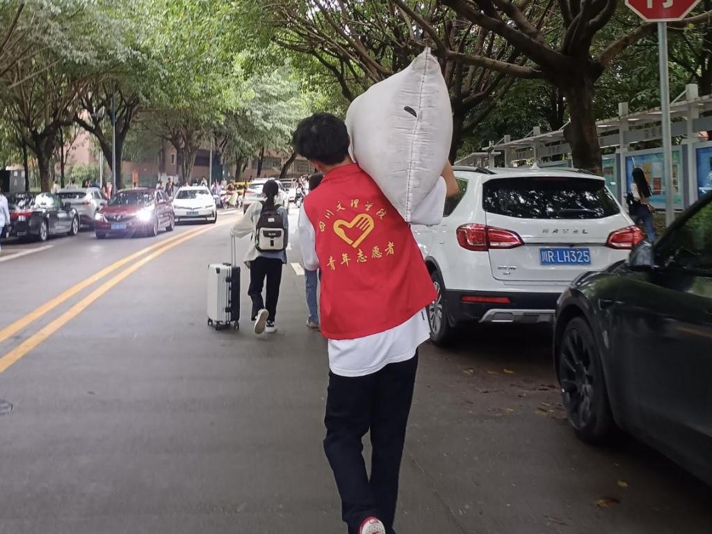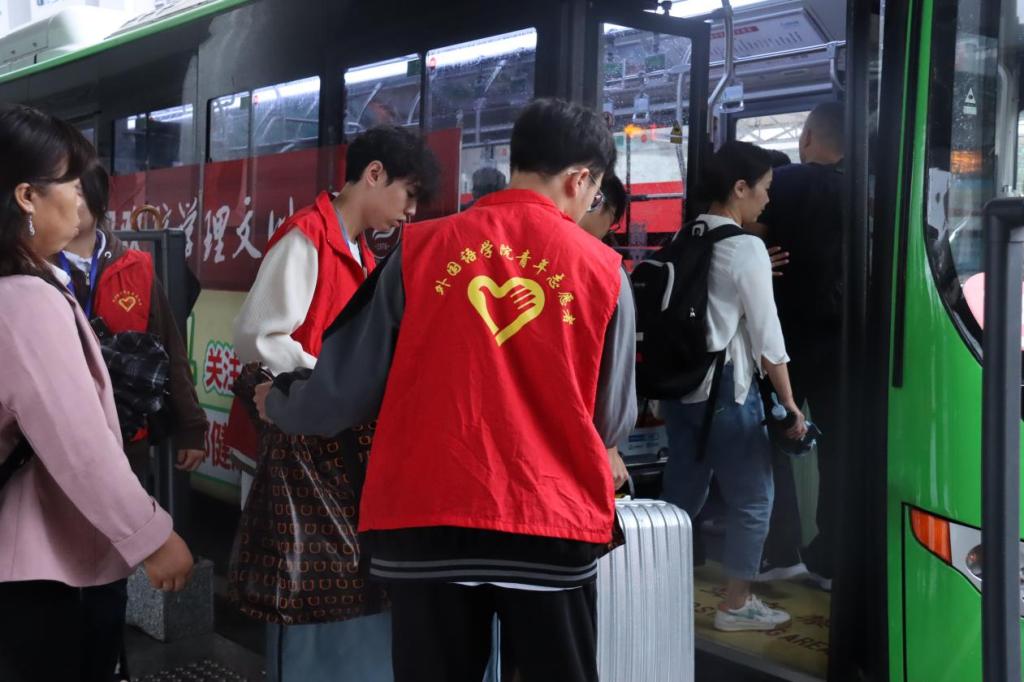 各个学院的学长学姐们耐心地给新生、家长回答着他们提出的各种问题。不少学长学姐们主动帮着拎行李,一路上谈笑风生。新生细声地叫着“学长学姐”,人头攒动,秩序井然。此次校外接站工作由外国语学院和数学学院的师生担任。