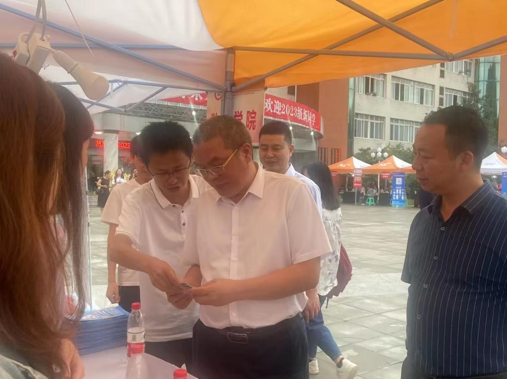 为切实做好2023年新生接待工作,学校成立了校、院两级迎新接待工作领导小组。9月12日上午,党委书记黄涛、党委副书记朱兴华及相关部门负责人前往各个迎新工作报到点,深入了解迎新工作进程,到各二级学院迎新点现场指导工作,并代表学校领导班子向辛勤忙碌的迎新工作者、志愿者表示亲切问候,向大一新生及家长表示热烈欢迎。