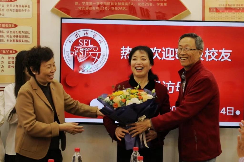 一朝沐杏雨,一生念师恩。在座谈会上,80级校友为退休教师汪成慧教授献花,表达对汪老师感恩与祝福。汪老师与大家一起回顾师生情谊,讲述当年的点点滴滴,表达了再次见到同学们的欣喜,并祝愿大家一切都好。