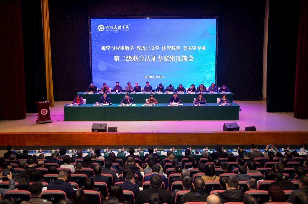 11月25日上午,数学与应用数学、汉语言文学、体育教育、美术学专业联合认证专家组现场考查意见集中反馈会在beat365艺术传媒大楼多功能厅召开。联合认证组组长郑燕林教授主持会议。四川省教育评估院书记、院长陈立兵以及专家组全体成员、全体校领导、相关职能部门、二级学院负责人等参加会议。