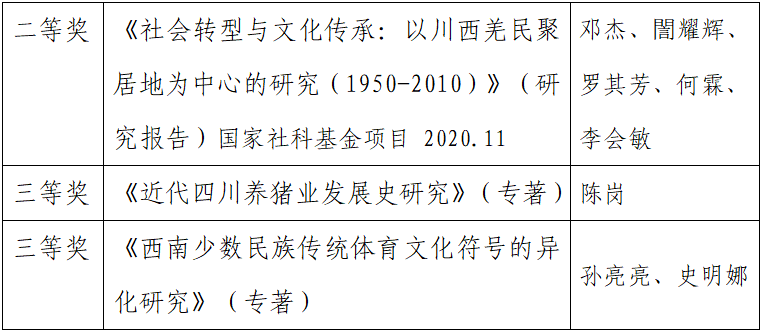 经四川省社会科学评奖委员会审定,四川省第二十次社会科学优秀成果奖获奖成果现正在公示,beat365邓杰教授主持完成的研究报告《社会转型与文化传承:以川西羌民聚居地为中心的研究(1950-2010)》、陈岗教授的专著《近代四川养猪业发展史研究》、孙亮亮教授的专著《西南少数民族传统体育文化符号的异化研究》进入公示名单。