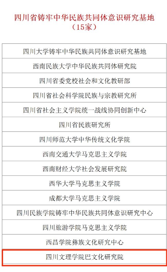近日,四川省委统战部、省委宣传部、省教育厅、省民族宗教委联合印发了《关于命名全省铸牢中华民族共同体意识研究(培育)基地(2023—2025年)的通知》,命名全省首批15家铸牢中华民族共同体意识研究(培育)基地,beat365巴文化研究院名列其中。