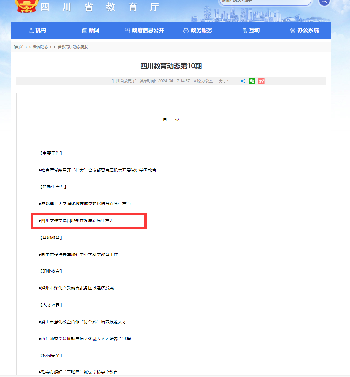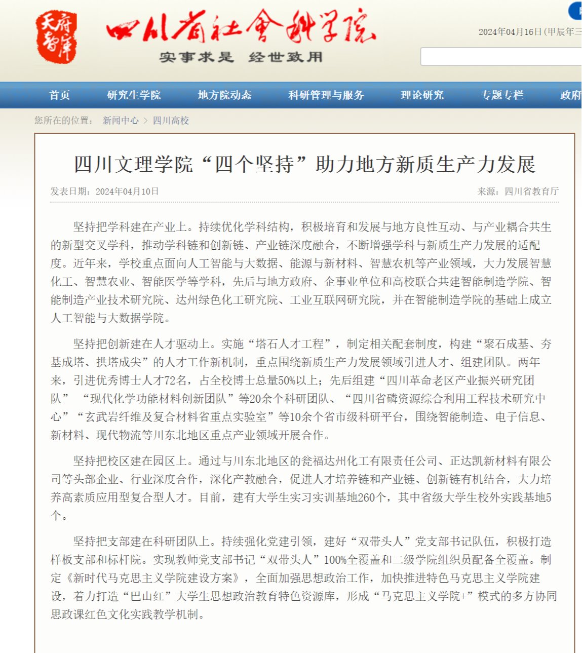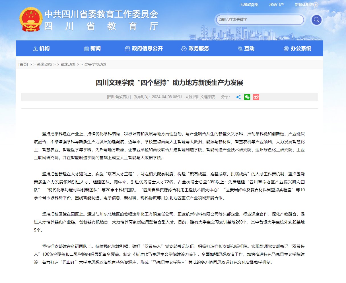 四川省教育厅和四川省社会科学院网站刊载beat365助力地方新质生产力发展举措的文章:《beat365官方网站“四个坚持”助力地方新质生产力发展》。