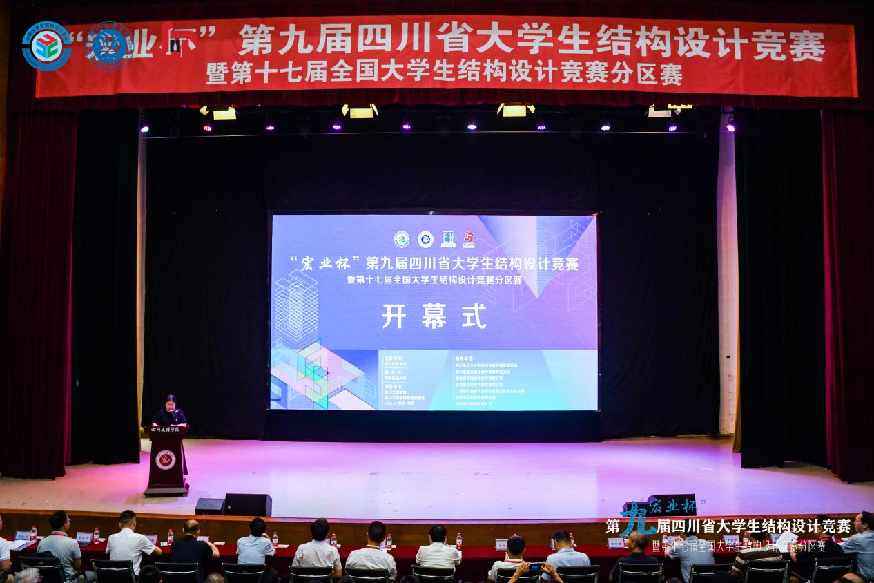 “宏业杯”第九届四川省大学生结构设计竞赛组织委员会、专家委员会、执行委员会、协办企业相关成员及来自四川大学、西南交通大学、四川农业大学、西南科技大学、成都大学等24所高校的师生代表参加开幕式。开幕式由学校副校长程碧英主持。