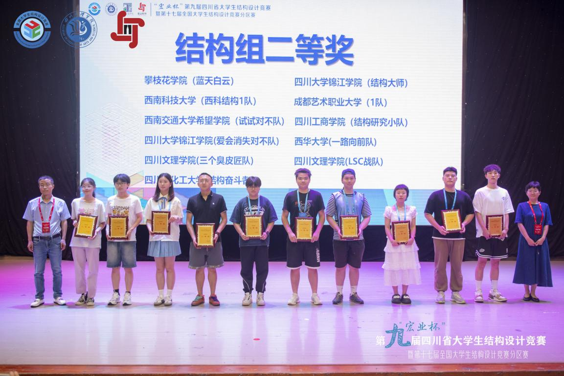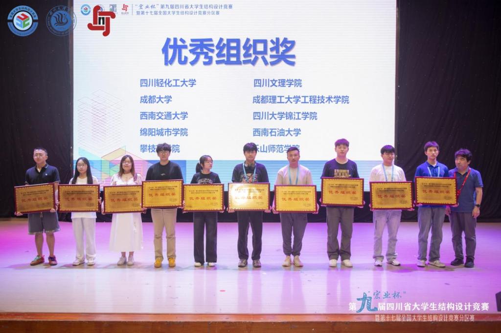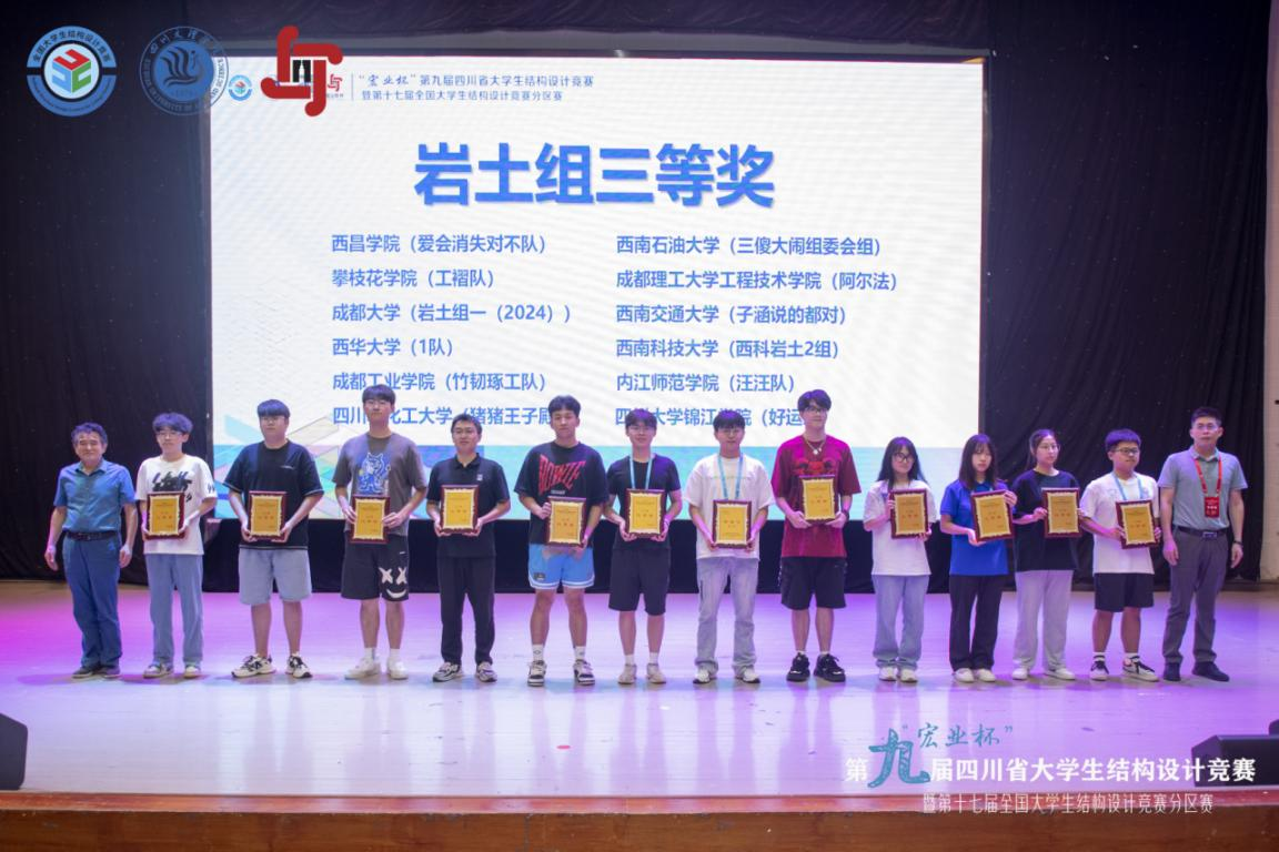 据悉,来自四川大学、西南交通大学等24所高校74支队伍进行了为期四天的激烈角逐,经过专家们公平公正公开的严格评审,本次竞赛最终评选出结构组一等奖8个、二等奖11个、三等奖15个;岩土组一等奖5个、二等奖8个、三等奖13个。特邀高校兰州理工大学获结构组一等奖和岩土组三等奖。四川轻化工大学等10所高校获优秀组织奖。成都理工大学工程技术学院等7所高校的8支队伍获结构组一等奖,成都大学等4所高校的5支队伍获岩土组一等奖,将有3支队伍代表四川省参加第十七届全国大学生结构设计竞赛。