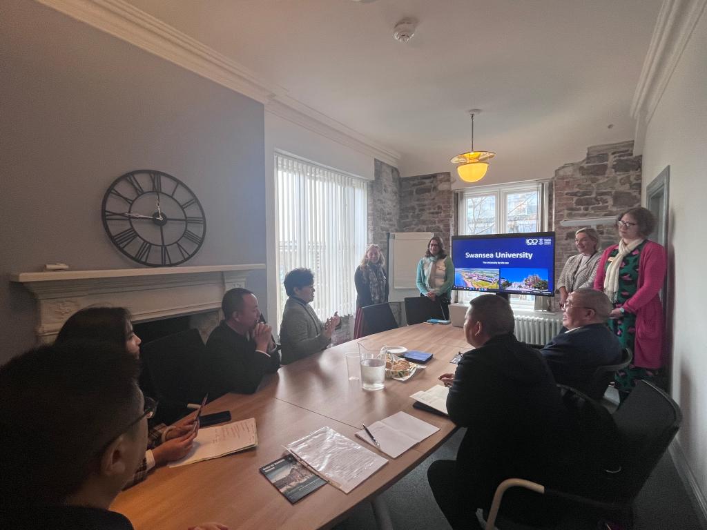 在斯旺西大学,代表团一行与社科学院Alan Collins 教授,经济学院Nigel Oleary 教授,邵婧教授作了亲切交流。负责国际交流合作的邵婧女士介绍了斯旺西大学与我国其他大学开展合作的各种模式。随后,双方就合作模式、奖学金、本科学位课程和科目学习、短期课外学生访问进行了深入细致的交流。代表团一行还参观了该校具有两百年历史的语言中心办公楼,并与语言中心负责人Joe Pariff教授, Lisa Langley教授, Jennifer Welti教授, Alison Davies教授深入交流,双方就师资培养和语言技能提升、专业语言的辅助能力提升等表达了良好的合作意向。