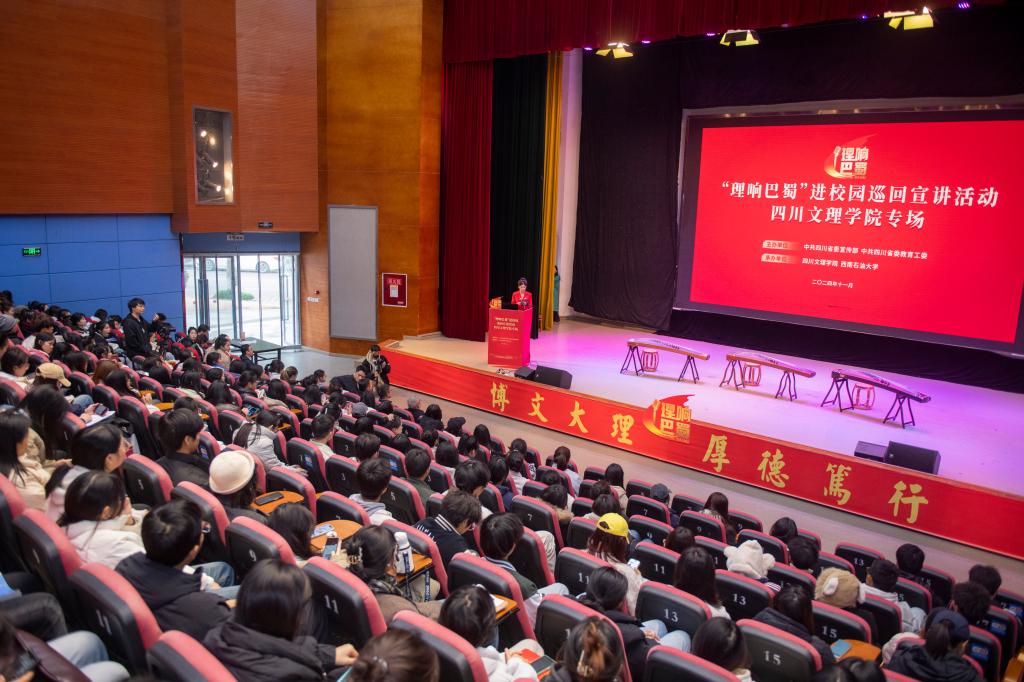 11月19日,“理响巴蜀”进校园巡回宣讲beat365官方网站专场活动,在beat365莲湖校区多功能厅举行。党委副书记徐晓宗致辞,西南石油大学党委宣传部副部长曹正老师带领西南石油大学学生刘宸、成都中医药大学学生朱宇来校宣讲。