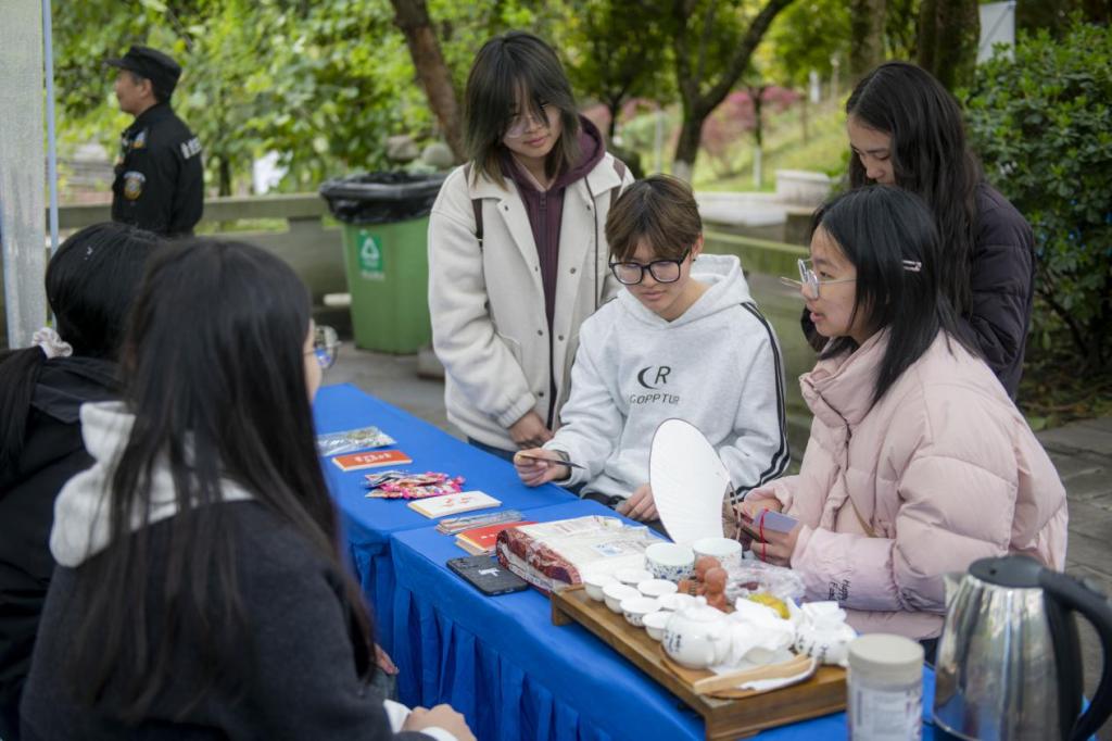 据悉,学校现有112个学生社团,实现了“万人百团”的目标,涵盖思想政治、学术科技、创新创业、志愿公益、文化体育、自律互助等类别。活动现场除了有各社团的风采展示外,还开展了传统文化类学生互动展演和各种各样沉浸式体验活动。活动设有古筝二胡、书法篆刻、趣味投壶、棋类博弈、竹编扇子DIY、茶艺展示、飞花令等多种项目,这一系列丰富多样的传统文化活动,吸引了众多师生驻足体验,在互动中深度感知中华优秀传统文化的魅力。