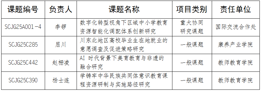 此次立项的4项课题包括国际交流合作处李锣老师牵头申报的《数字化转型视角下区域中小学教育资源智能化调配体系创新研究》重大协同项目,该项目系beat365在四川省教育科学规划项目中立项的最高级别项目。另外,康养产业学院屈川老师申报的《川东北地区高校毕业生在地就业的意愿调查及促进策略研究》、教师教育学院赵栅凌老师的《AI 时代背景下美育教育与非遗的融合研究》、杨士连老师的《小学铸牢中华民族共同体意识教育课程资源研制与实施路径研究》成功入选一般课题。