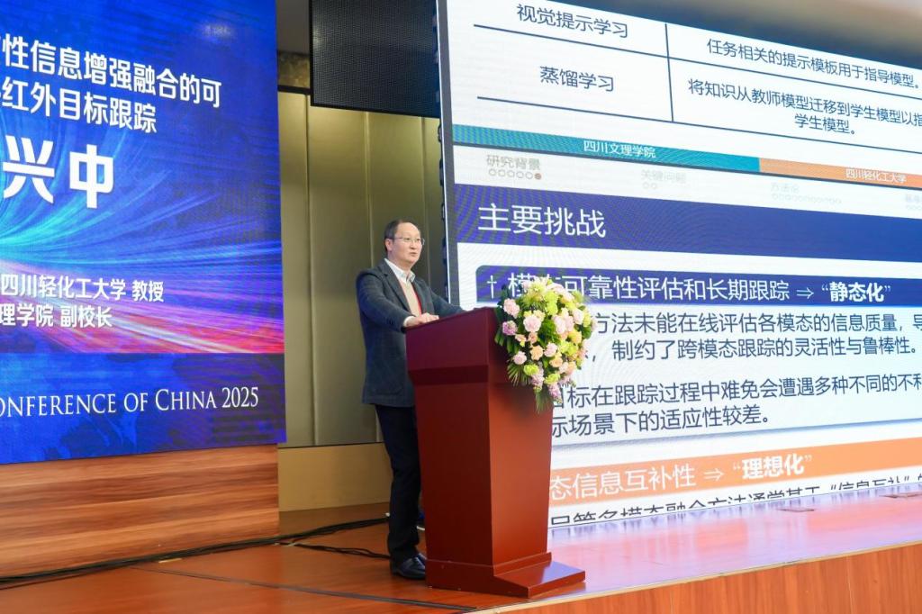 熊兴中教授应邀在大会作了题为《基于跨模态一致性信息增强融合的可见光与热红外目标跟踪》的主题报告。报告针对复杂环境下智能感知的动态适应与长期稳定跟踪难题,创新性地提出了“动态感知—冲突治理—长期记忆”的一体化技术体系。该技术通过在线评估多模态可靠性、智能抑制信息冲突、融合长效记忆机制,为实现低空技术与工程、公共安全、边境监控等场景中鲁棒、稳定的目标跟踪提供了创新解决方案。报告内容前沿、逻辑清晰,引发了与会专家的热烈讨论与高度评价。