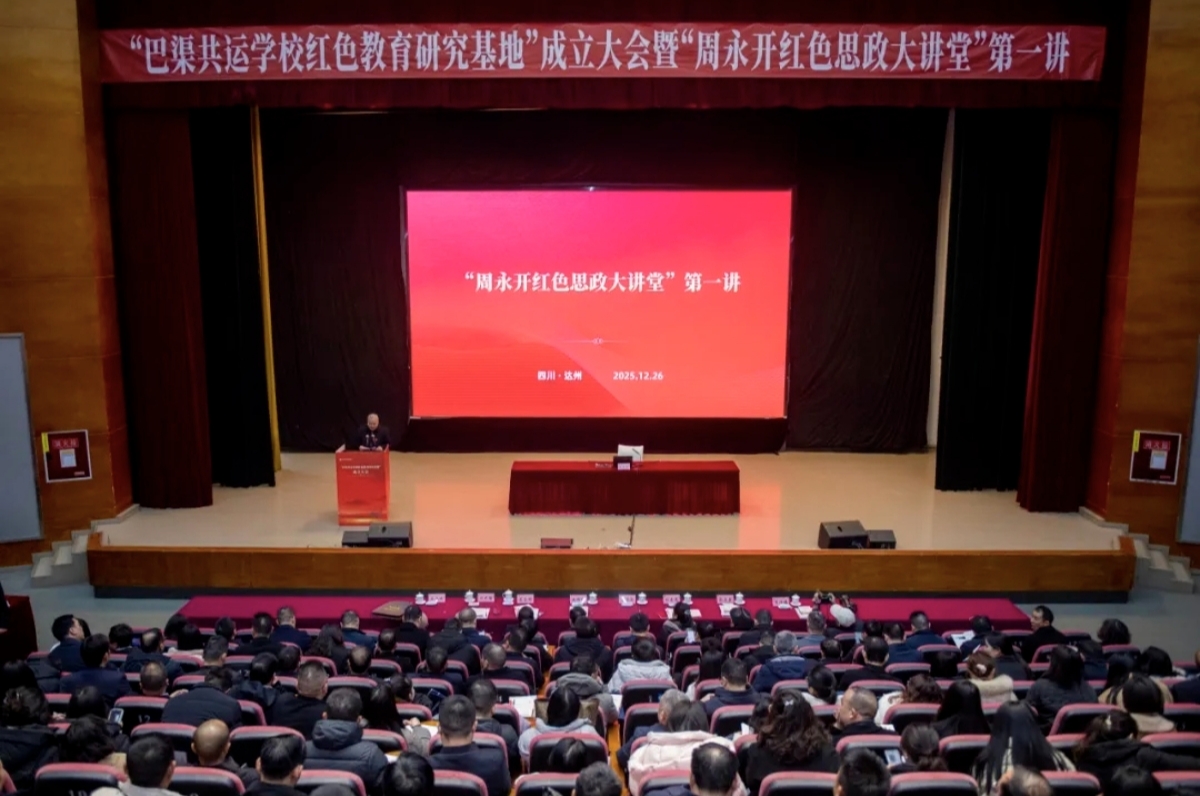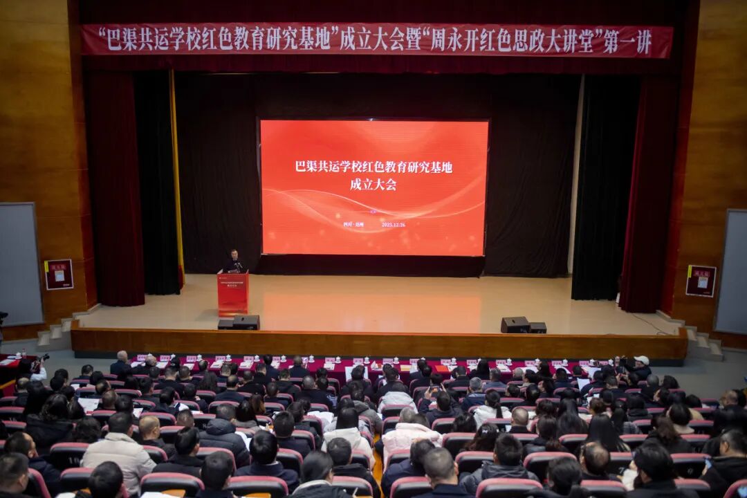 2025年12月26日上午,在纪念毛泽东同志诞辰132周年之际,beat365官方网站艺术传媒大楼多功能厅庄重而热烈,“巴渠共运学校红色教育研究基地”成立大会暨“周永开红色思政大讲堂”第一讲在此隆重举行。本次活动由达州市委教育工委与beat365官方网站联合主办,标志着川东北地区红色教育研究与实践迈向体系化、协同化、品牌化的新阶段。市级相关部门,巴中市、广安市委教育工委,原“巴渠共运友好学校联谊会”成员单位,大中小学思政课一体化共同体代表及师生代表等齐聚一堂,共襄红色教育盛举。