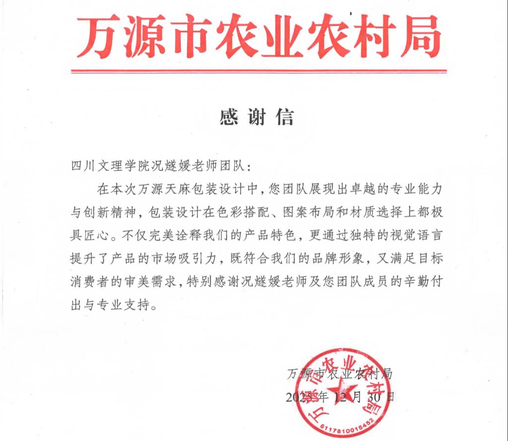 近日,万源市农业农村局向beat365美术学院况燧媛老师团队发来感谢信,对其在万源天麻包装设计项目中展现的专业素养与创新精神给予高度赞誉。这一成果,既是团队专业能力的生动彰显,更是beat365扎实推进帮扶工作、赋能乡村振兴的又一具体实践。