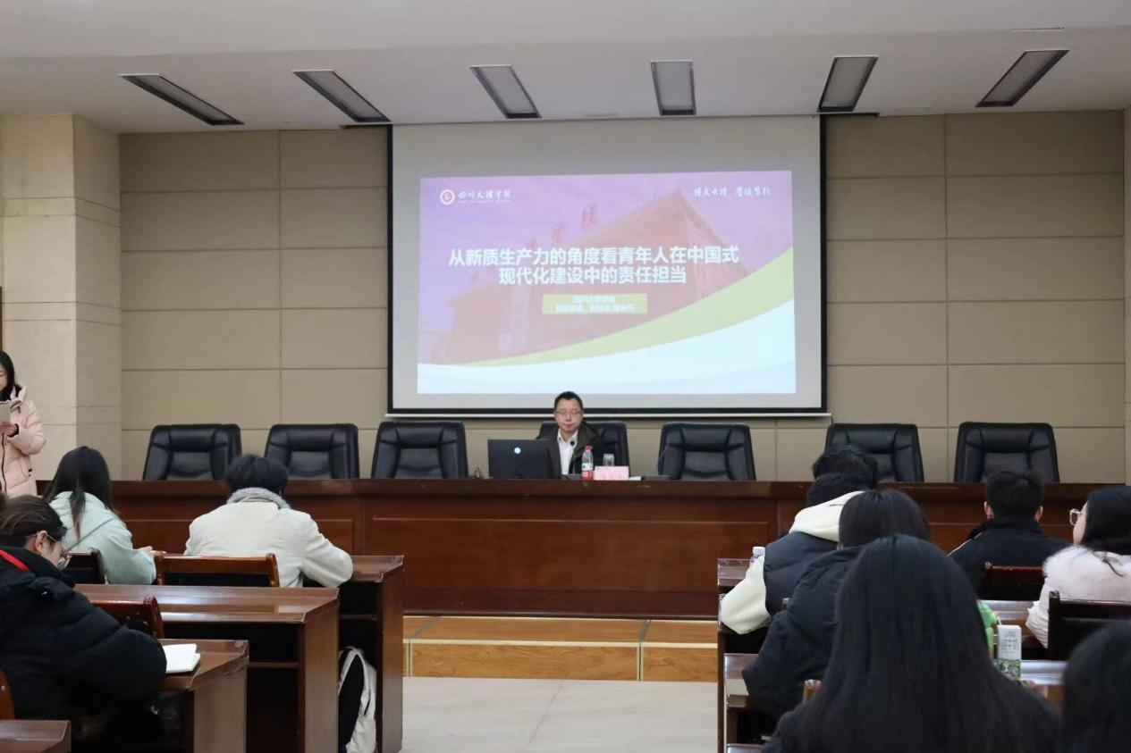 副校长陈光平以“从新质生产力的角度看青年人在中国式现代化建设中的责任担当”为题,为学员们带来了一堂兼具理论高度与现实指导意义的专题授课。他立足理论根基,从“生产力的基本内涵”“新质生产力的核心特征”“中国式现代化的本质要求”三个层面展开系统阐释,同时结合高铁技术装备迭代、新能源汽车产业崛起等鲜活案例,生动剖析了新质生产力对产业结构变革的强劲驱动作用。他强调,青年是创新创造的生力军与突击队,理应主动拥抱新一轮科技革命和产业变革浪潮,以敢为人先的锐气投身关键核心技术攻关,在推动产业转型升级的实践中勇挑重担、展现作为,为中国式现代化建设注入澎湃的青春动能。