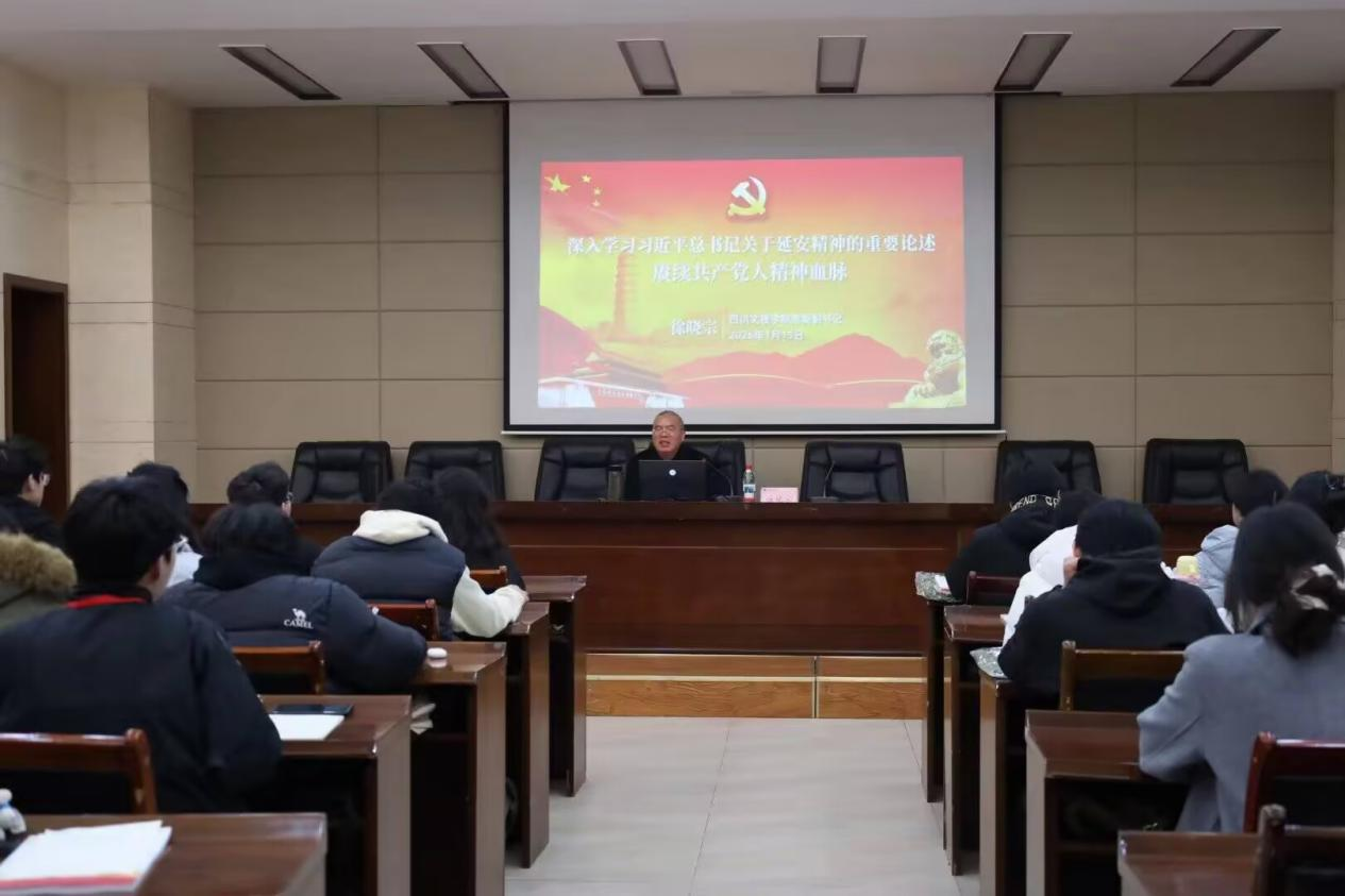 学校党委副书记徐晓宗以“深入学习习近平总书记关于延安精神的重要论述,赓续共产党人精神血脉”为题,结合自身在延安干部学院的学习经历娓娓道来,他从党中央和中央红军长征切入,生动阐释了中国共产党在延安13年取得的辉煌成就,全面分析了延安精神形成的历史背景、实践基础、主体条件、原生形态。他领学了习近平总书记关于延安精神的重要论述,指出延安精神是中国共产党及其领导的人民军队在延安时期形成的优良传统和作风。他还向与会学员介绍了习近平总书记在梁家河七年的知青岁月,希望大家向青年习近平学习,深入回答好“什么是实际、什么是实事求是、什么是群众”这三个问题,坚定不移听党话、跟党走,立志做有理想、敢担当、能吃苦、肯奋斗的新时代好青年。