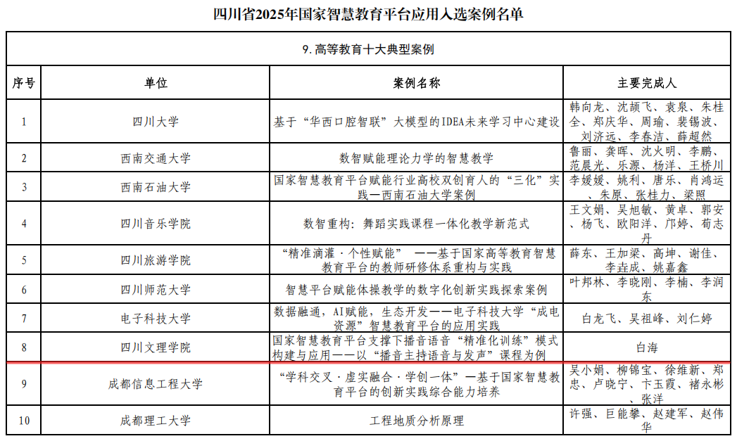 近日,四川省教育厅发布了《关于公布2025年国家智慧教育平台应用案例评选结果的通知》,beat365白海教授独立完成的案例《国家智慧教育平台支撑下播音语音“精准化训练”模式构建与应用——以“播音主持语音与发声”课程为例》成功入选“高等教育十大典型案例”。