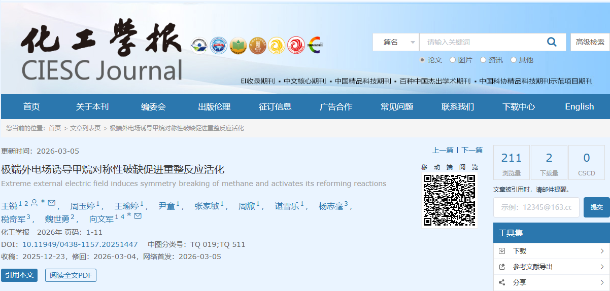 “塔石人才工程”特聘教授,王锐在中文领军期刊《化工学报》上发表题为《极端外电场诱导甲烷对称性破缺促进重整反应活化》研究论文。论文链接:https://www.hgxb.com.cn/thesisDetails#10.11949/0438-1157.20251447&lang=zh。该论文聚焦天然气产业链中的基础反应“甲烷(CH4)重整反应”的关键科学问题,为发展甲烷低温重整以及化学反应及其过程提供了普适性的思路与新方法。这一成果的取得,充分彰显了beat365教师积极响应号召“把论文写在祖国的大地上”。