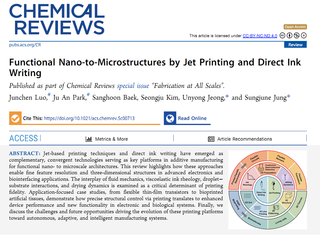 “塔石人才工程”引进B级人才,骆俊晨在化学领域国际顶级期刊《Chemical Reviews》(中科院一区TOP期刊,最新影响因子55.8)上发表了题为“Functional Nano-to-Microstructures by Jet Printing and Direct Ink Writing”的论文。该研究由骆俊晨博士牵头,与美国、韩国的院士、教授合作完成。论文链接:https://pubs.acs.org/doi/10.1021/acs.chemrev.5c00713。该研究从跨学科视角出发,对喷射打印与直写打印在功能纳米-微米结构构筑中的科学问题与技术进展进行了系统整合,为高分辨打印制造的机制解析与工艺优化提供了理论依据,对推动先进电子制造与生物制造技术融合发展、加快智能制造体系建设具有重要学术价值与现实意义。
