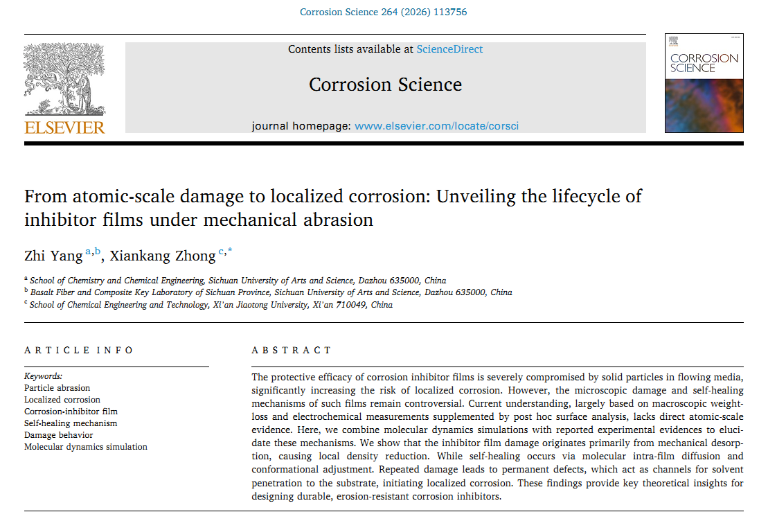“塔石人才工程”引进副教授,杨志在国际腐蚀领域顶级期刊《Corrosion Science》(中科院一区,最新影响因子8.5)上发表最新研究成果“From atomic-scale damage to localized corrosion: Unveiling the lifecycle of inhibitor films under mechanical abrasion”,论文链接:https://doi.org/10.1016/j.corsci.2026.113756。该研究聚焦油气管道腐蚀防护中的实际问题,针对缓蚀剂膜在颗粒磨蚀下防护效能衰减的行业痛点,明确了膜损伤的核心诱因、自修复的实现路径,以及永久缺陷引发局部腐蚀的作用过程,为耐冲蚀腐蚀缓蚀剂的研发提供了理论参考。该研究获国家自然科学基金、学校高层次人才启动基金支持,是依托玄武岩纤维及复合材料四川省重点实验室,开展跨校及学科交叉合作的重要学术成果。