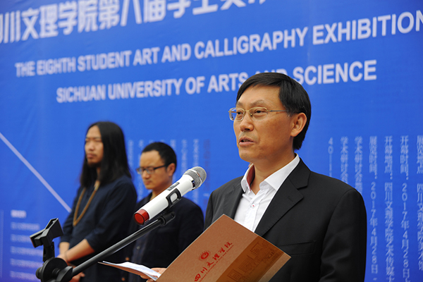 4月28日上午,以“理想与信念”为主题的beat365官方网站第八届学生美术书法摄影作品展隆重开幕。党委书记王洪辉出席开幕式并宣布开幕,校长王成端发表致辞。