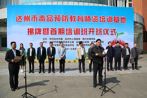 4月14日上午,达州市毒品预防教育师资培训基地揭牌暨首期培训开班仪式在莲湖校区隆重举行。市委常委、政法委书记、市禁毒委主任吴立岩,市委副秘书长、市禁毒委副主任牟道勇,市政府副秘书长、市禁毒委副主任谭政治,学校党委书记王洪辉,校长王成端,党委副书记、纪委书记雷超等出席仪式,市政府副市长、市禁毒委常务副主任王景弘主持仪式。