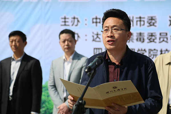 市委副秘书长、市禁毒委副主任牟道勇在揭牌仪式上宣读《达州市禁毒委员会办公室关于确立达州市毒品预防教育师资培训基地和青少年毒品预防教育示范学校的通知》。